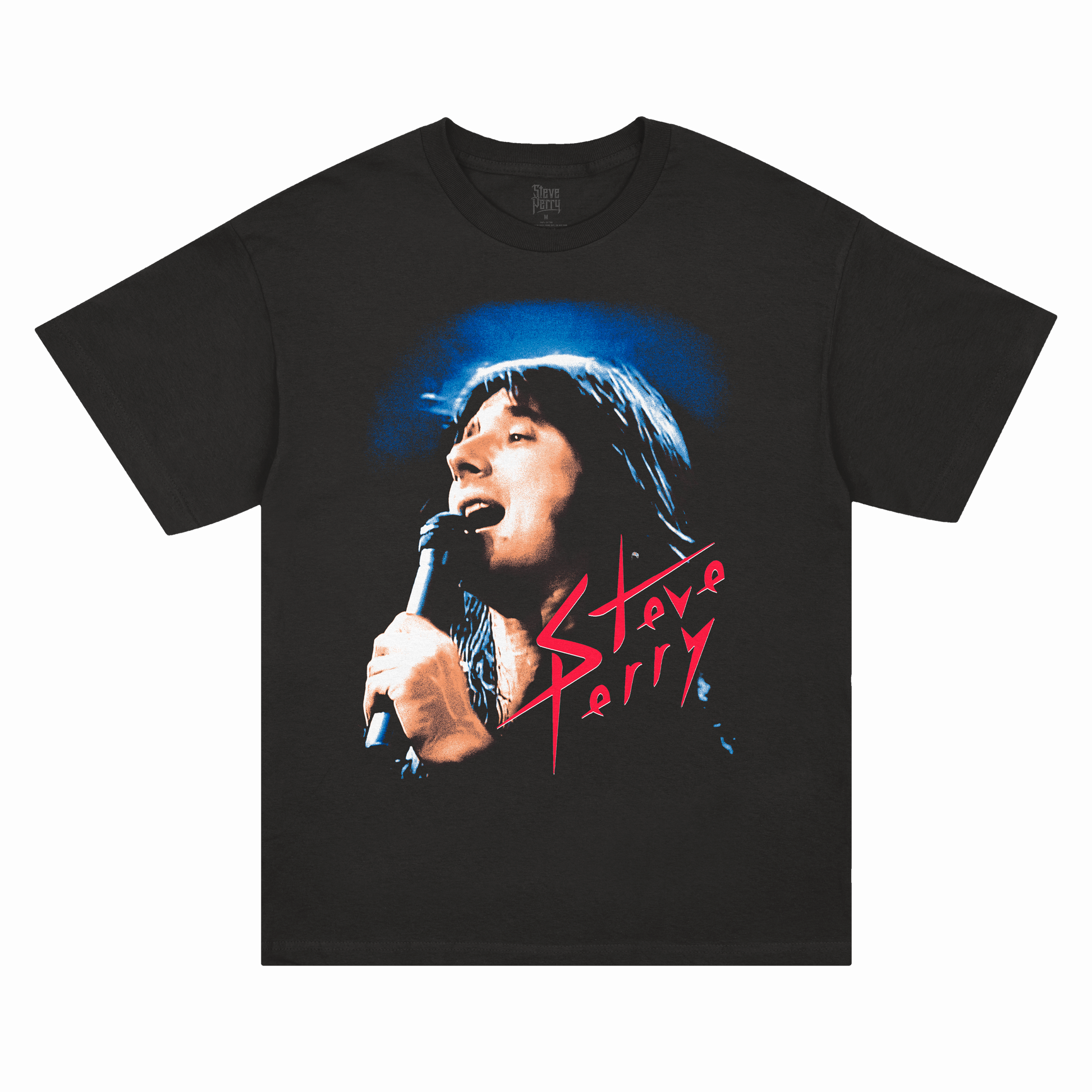 A timeless tribute to Steve Perry, this black tee features a soft, screenprinted portrait accented by his signature logo in bold red.