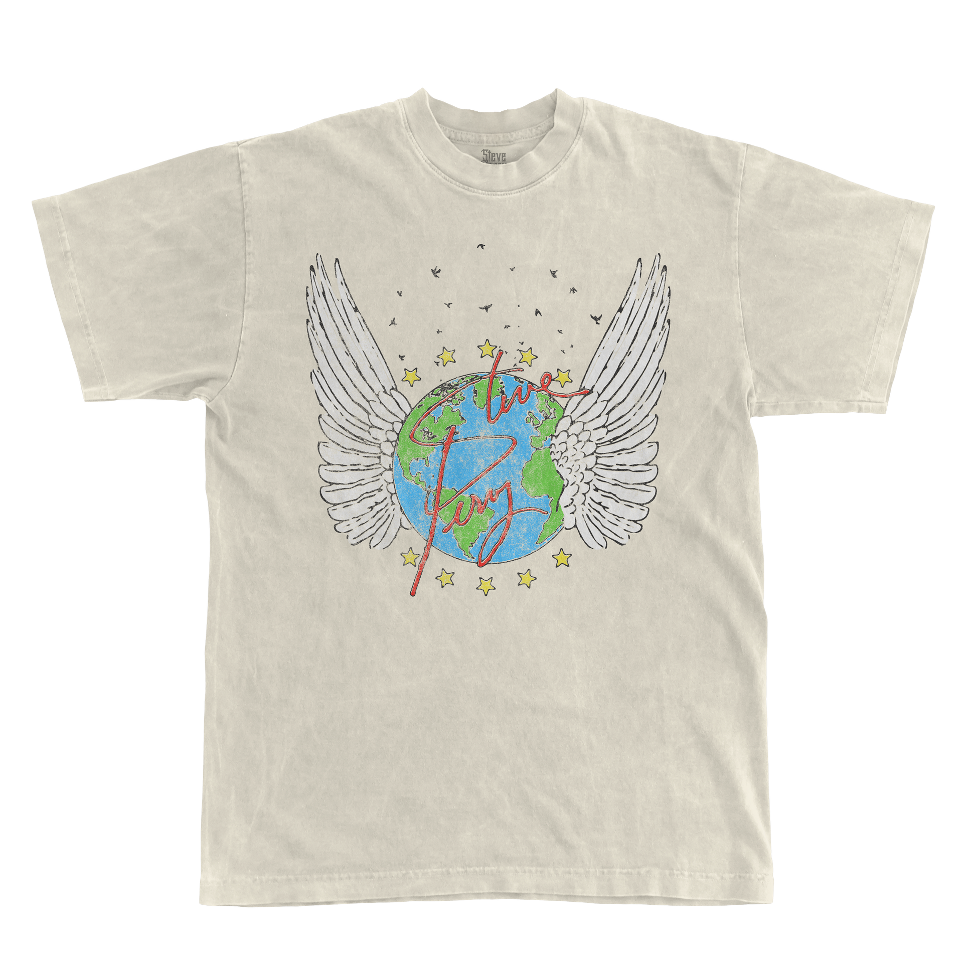 Inspired by the legacy of Steve Perry, this black tee features a hand-drawn winged Earth design surrounded by stars and his iconic signature.